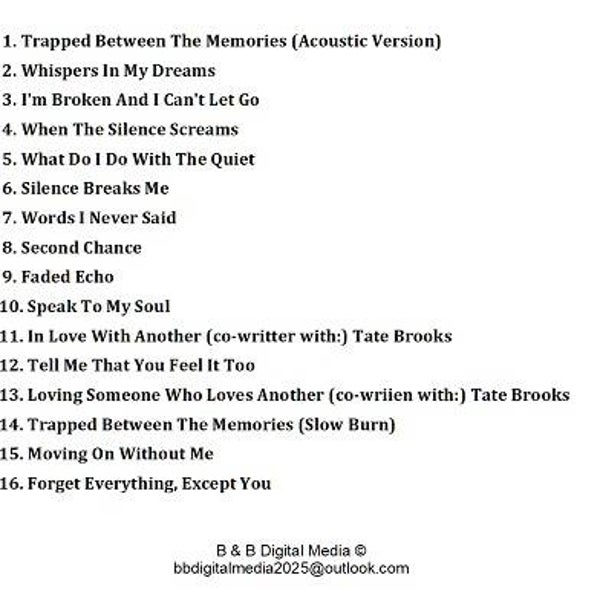 Trapped Between The Memories is an 16-track collection of deeply emotional songs about love, loss, and everything in between. Each track lives exactly where the title does — caught between what was, what still hurts, and what still holds love.